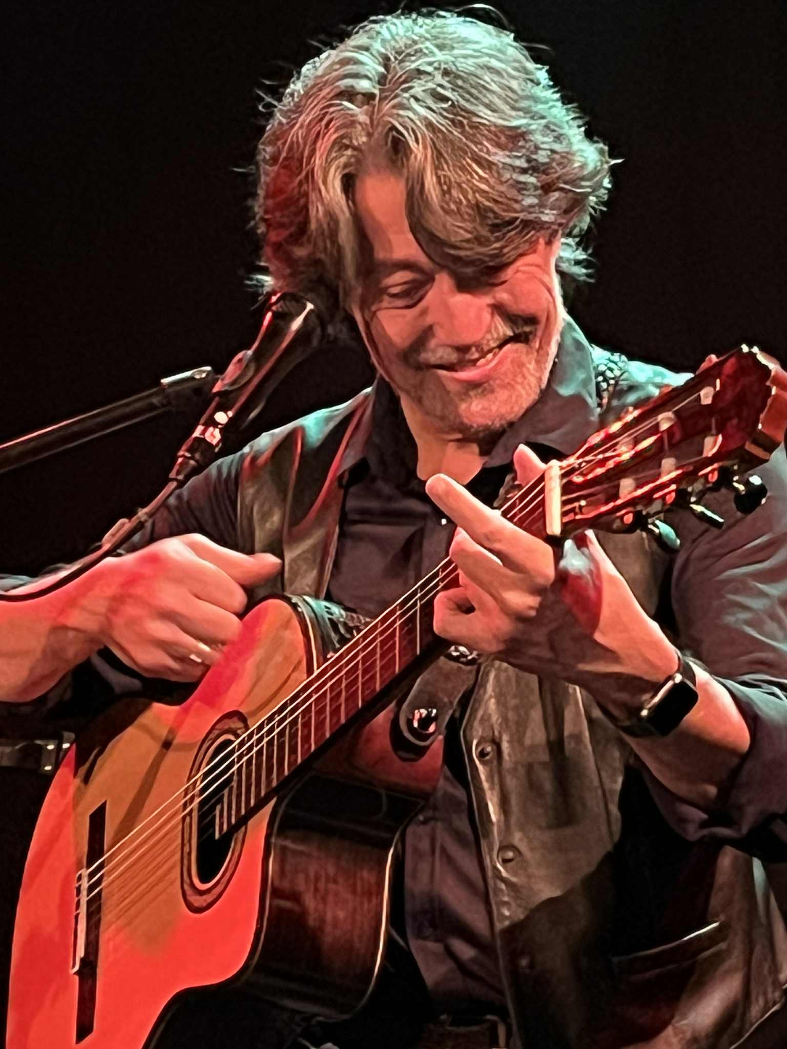 Sur scène, porté par son sourire légendaire, il se donne corps et âme, multipliant les émotions à coups de notes et de mots. Ses fidèles complices, Acadie et Morgane, ses deux guitares de bois et de cordes, forment avec lui un trio magique : il les fait vibrer, les caresse, les fait chanter pour le plaisir des yeux et des oreilles.